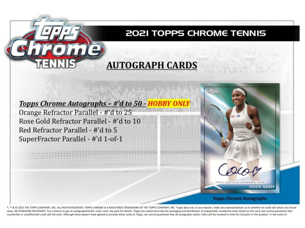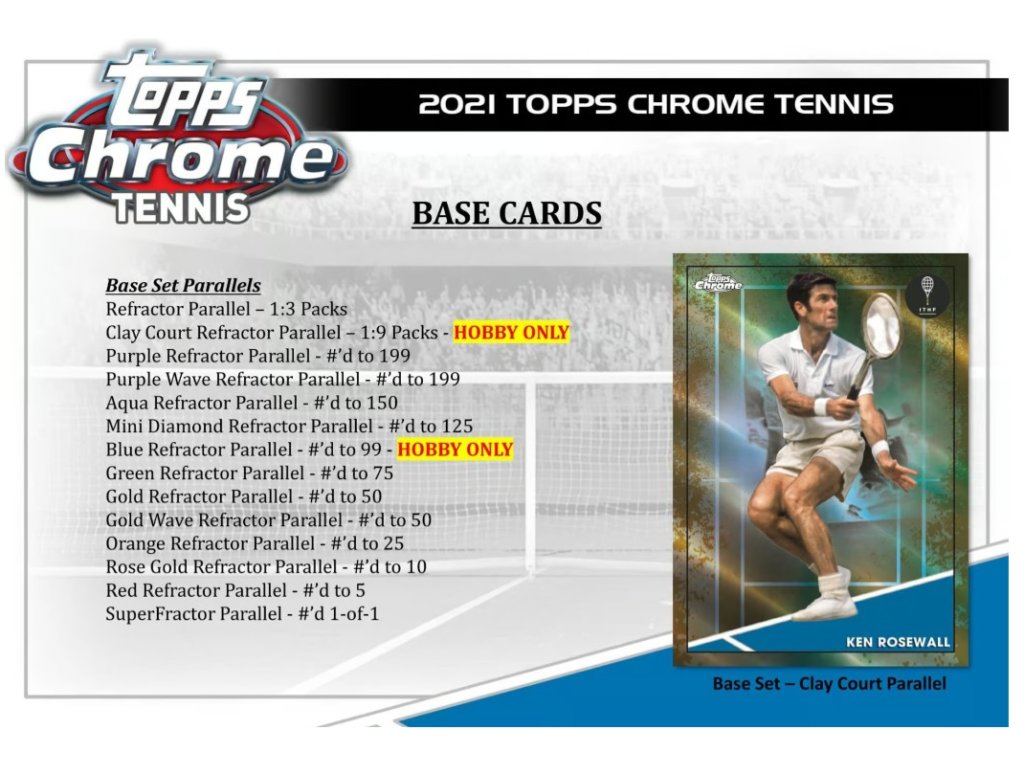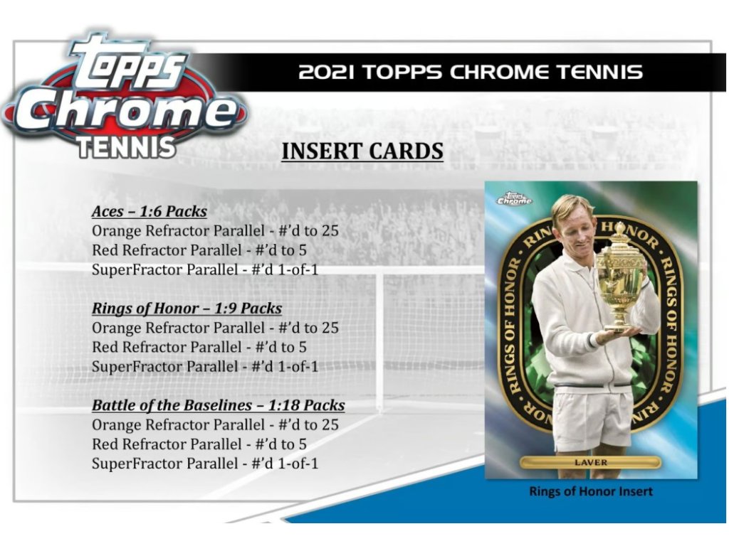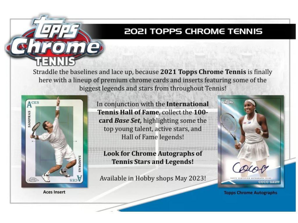 Připoutejte se a připravte se, protože Topps Chrome Tennis 2021 je konečně tady! Nabízíme výběr vysoce kvalitních chromovaných karet a insertních karet s motivy některých z největších legend a hvězd světa tenisu!