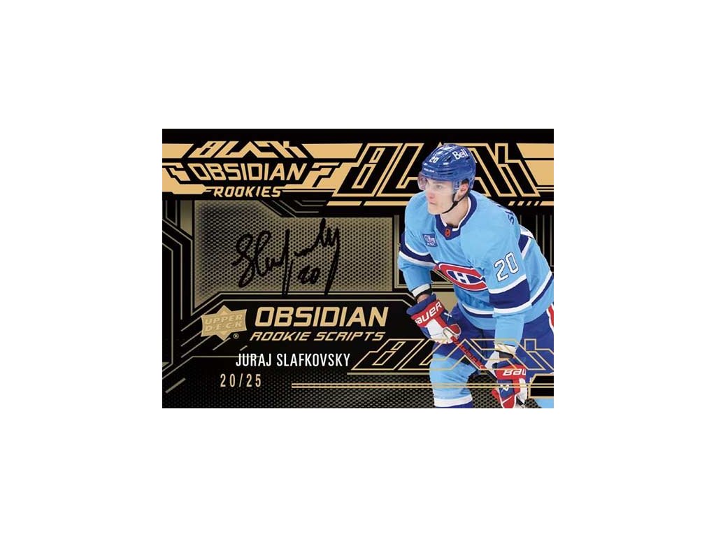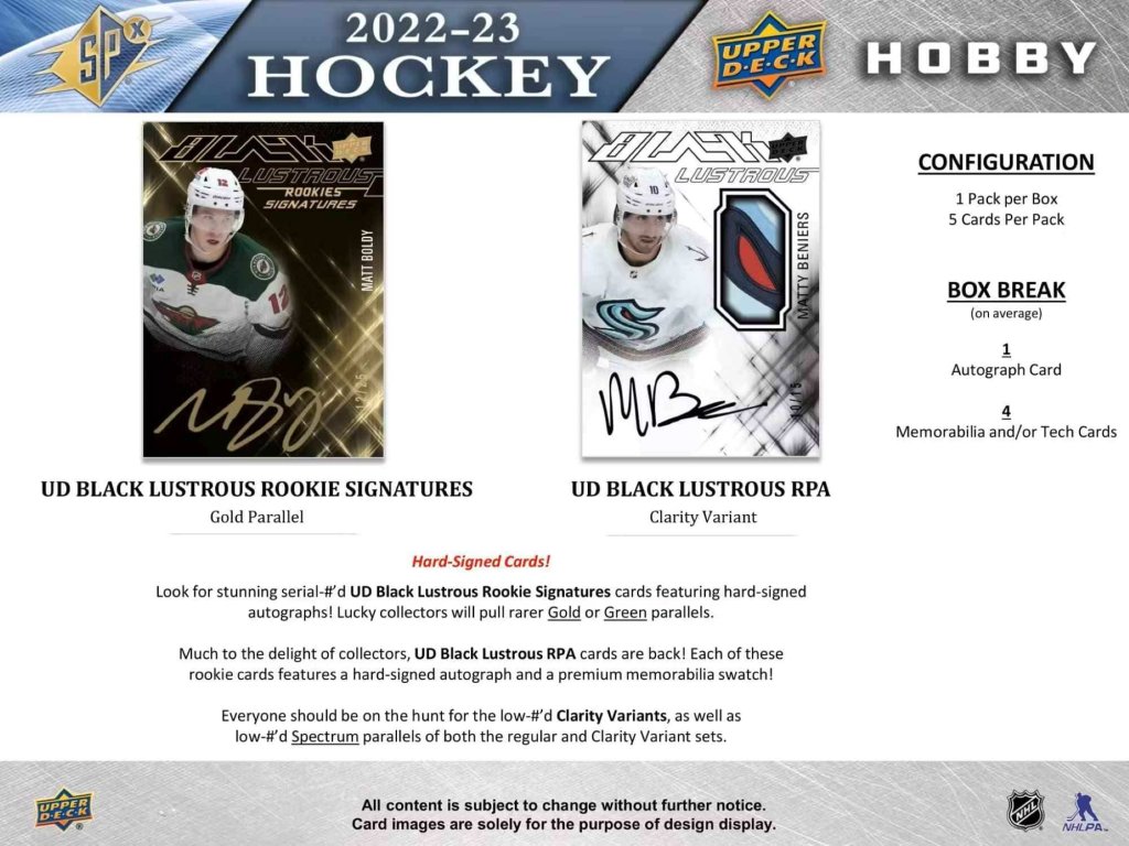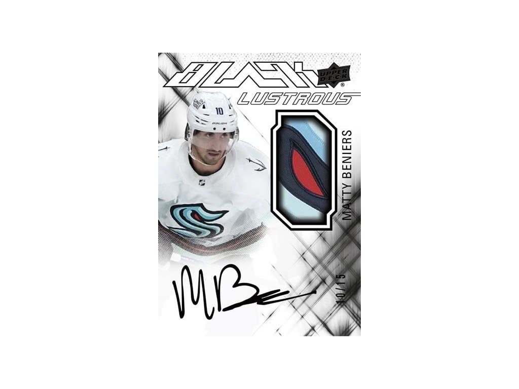 - UD Black Lustrous Rookie Auto Patch (RPA) jsou zřejmě tím největším lákadlem v sérii. Každá karta obsahuje hard-signed podpis a premium memorabilia patch! Můžete také nalézt bílou verzi této karty, velmi nízce limitovanou Clarity Variant anebo verzi Spectrum 1/1, a to dokonce od obou verzí. V případě, že na této kartě naleznete top nováčka (např. Beniers, Boldy, Wright, Slafkovský apod.) budete mít v rukách skutečný klenot.