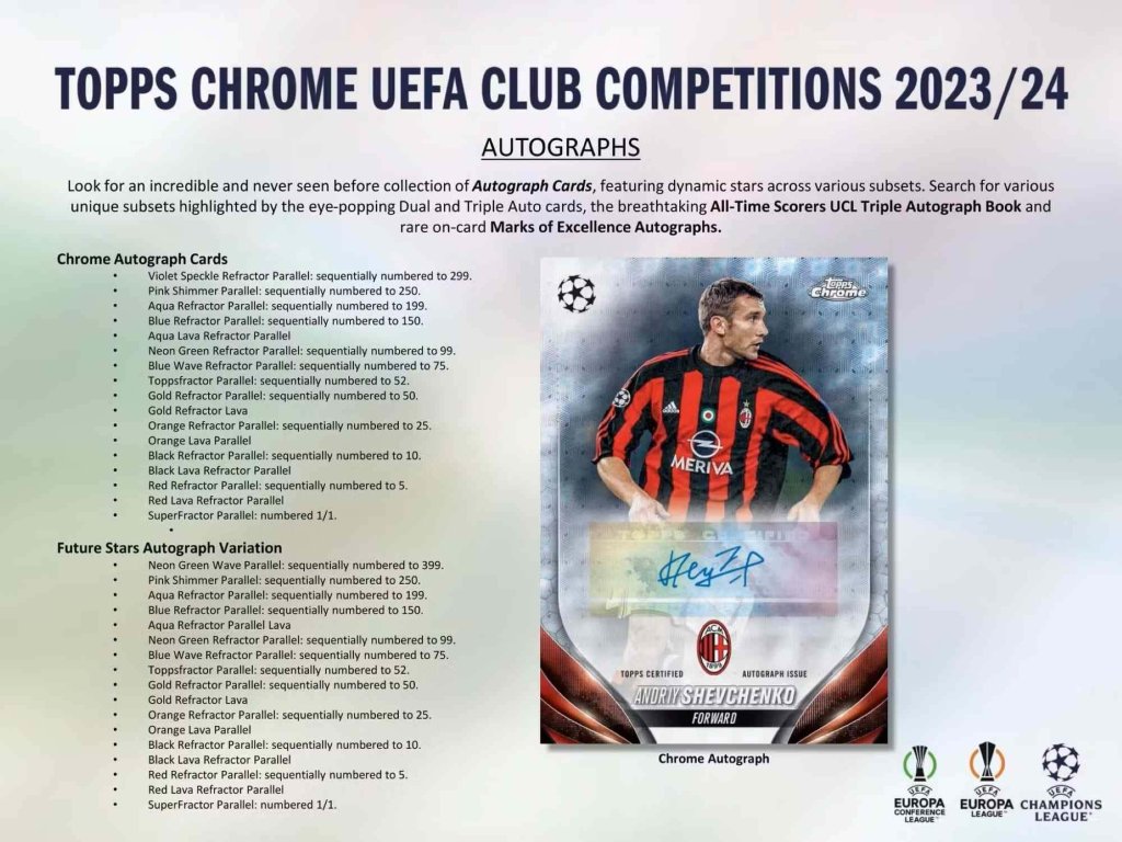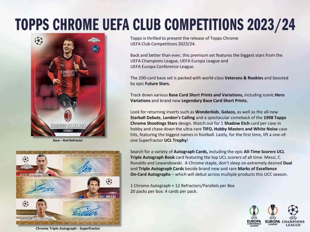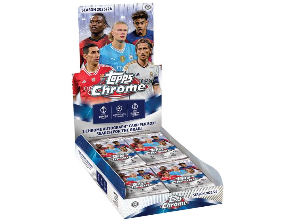 Společnost Topps s potěšením představuje vydání Topps Chrome pro klubové soutěže UEFA 2023/24. Tato prémiová sada je zpět a je lepší než kdy dříve a obsahuje největší hvězdy Ligy mistrů UEFA, Evropské ligy UEFA a Evropské konferenční ligy UEFA.