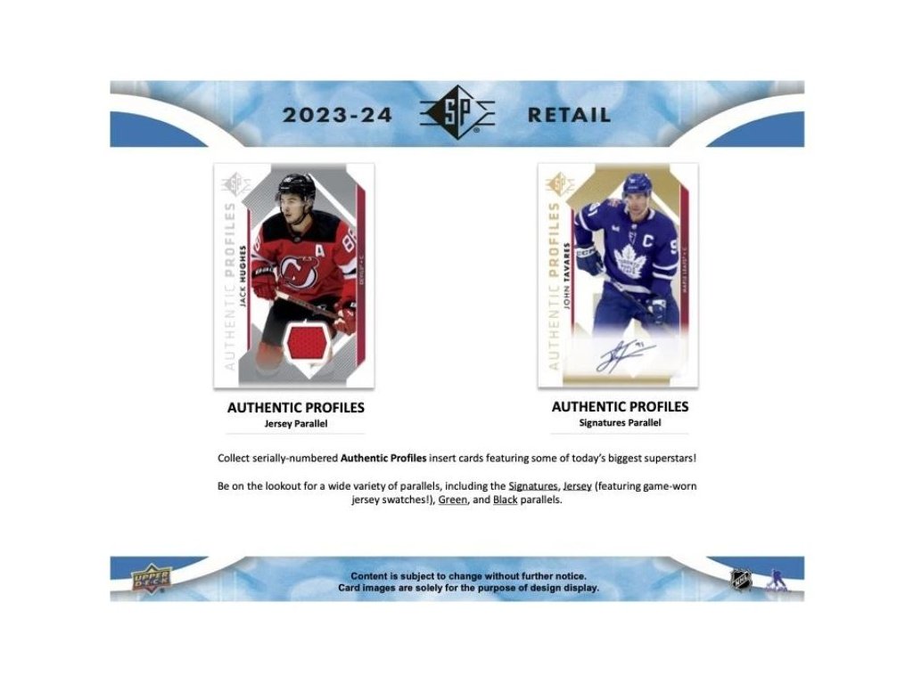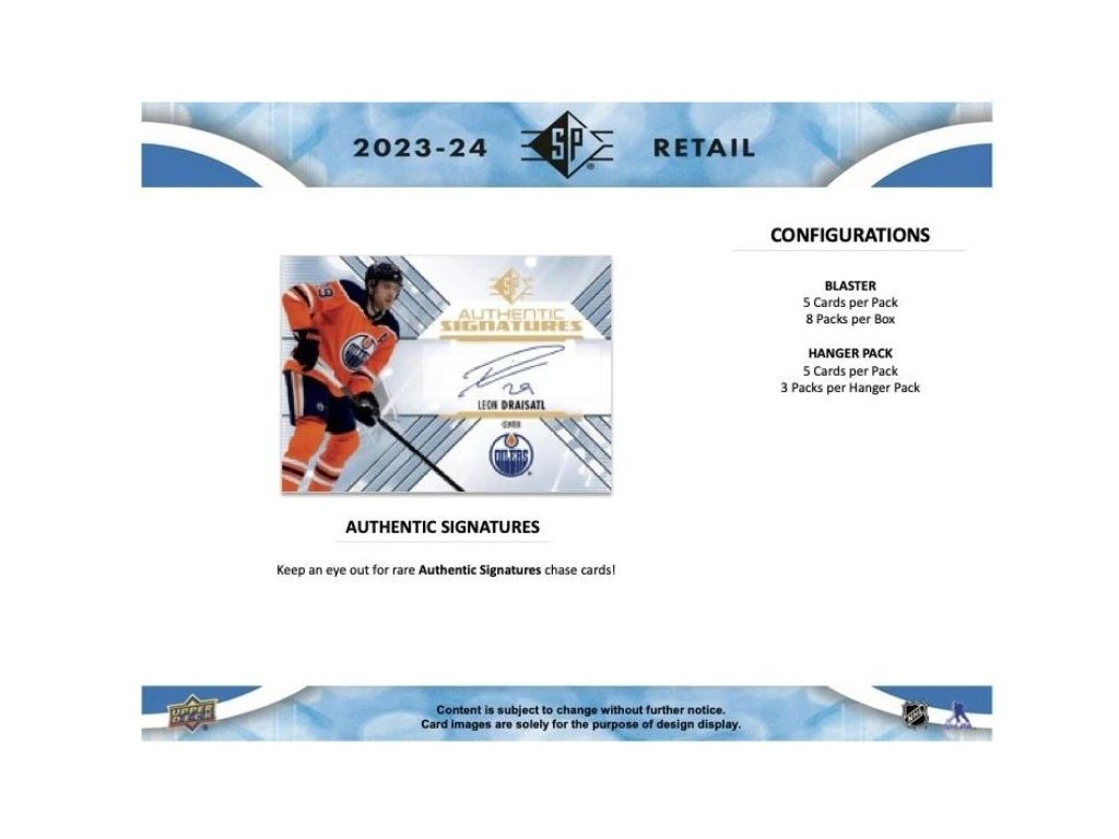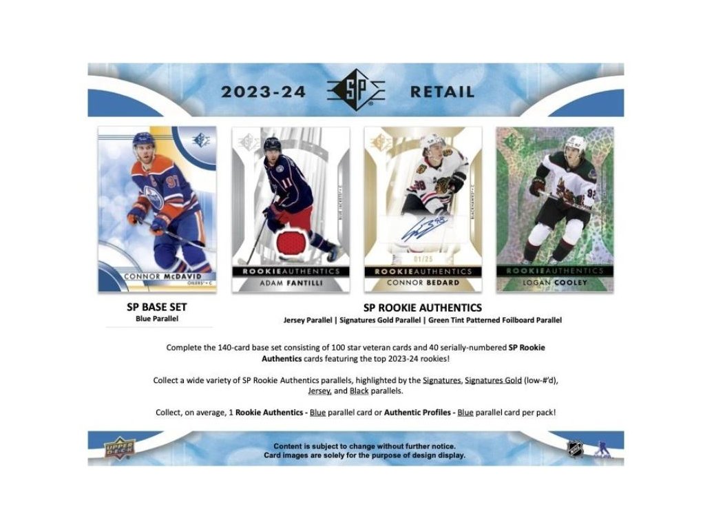 Retail verze série 2023-24 UD SP Authentic přináší základní set složených ze 100 řadových karet současných hokejových hráčů kanadsko-americké NHL (veteráni) a 40 top nováčků, kteří jsou navíc na limitovaných kartách! Ale pozor, můžete také nalézt podepsané karty s velmi zajímavými jmény, v čele s CONNOREM BEDARDEM!
