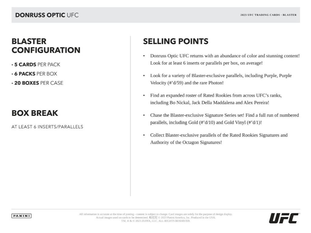UFC karty 2023 Panini Donruss Optic UFC Blaster Box obsahuje 6 balíčků a 5 karet v balíčku - celkem 30 karet!