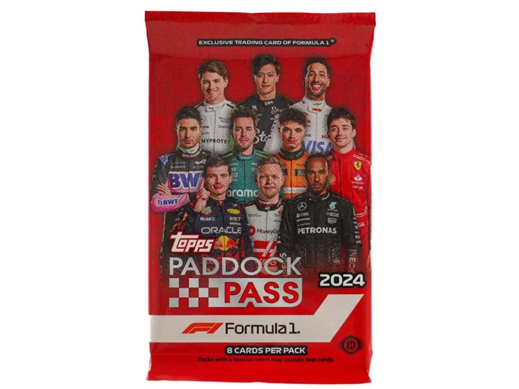 F1 karty 2024 Topps Formula 1 Paddock Pass Hobby Box obsahuje 16 balíčků a 8 karet v balíčku - celkem 128 karet!
