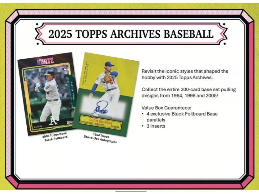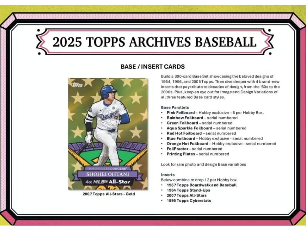 Archivní baseballová kolekce Topps 2025 se vrací s oslavou designů, které formovaly desetiletí sběratelství. Letošní základní sada 300 karet se vrací ke třem oblíbeným stylům Topps: 1964, 1996 a 2005. Kontrolní seznam obsahuje legendy, nováčky i oblíbence fanoušků, spolu se vzácnými variacemi obrázků a designů napříč všemi třemi obdobími.