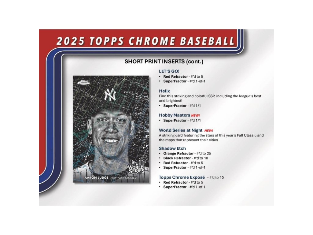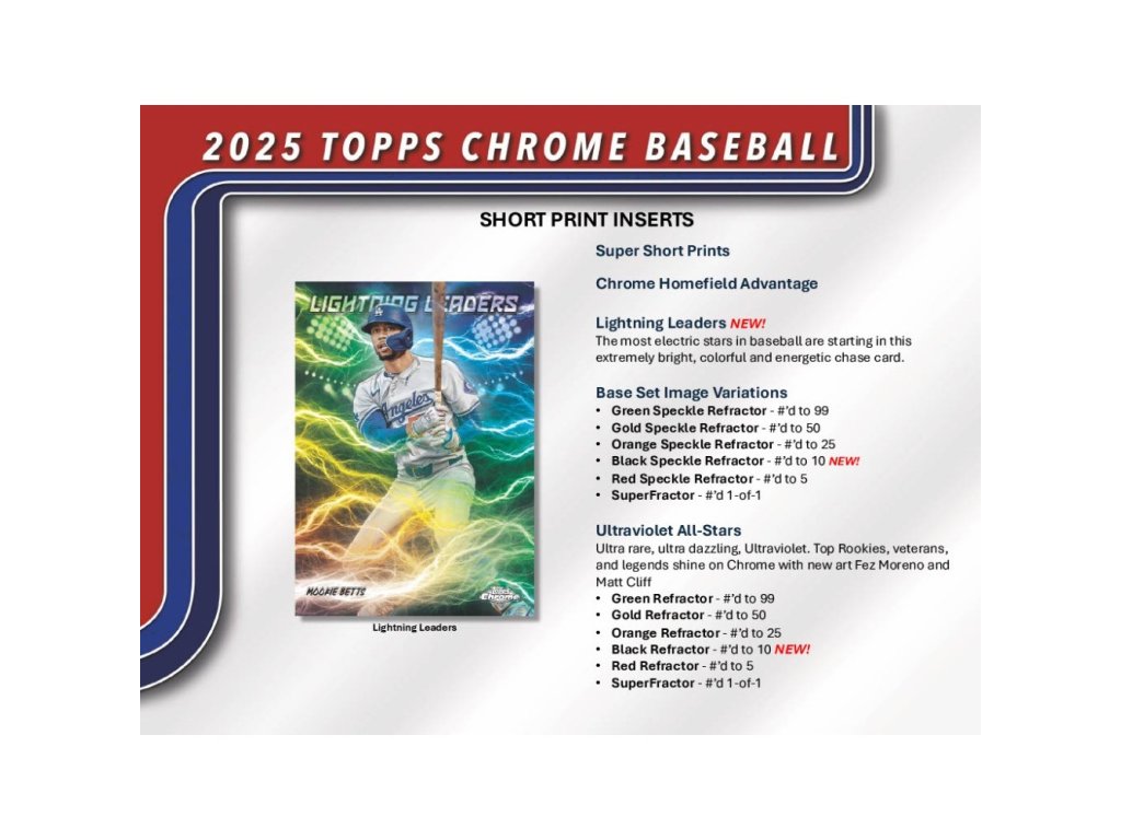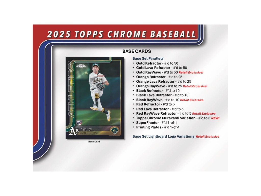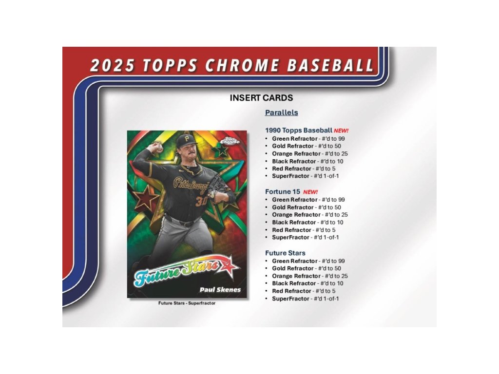 2025 Topps Chrome Baseball představuje 30. vydání chromových karet svého vlajkového produktu. Letošní edice obsahuje vzrušující přírůstek zlatých Logoman mamorabilií. Base set podtrhuje široká kolekce barevných Refraktorek a v centru pozornosti celého produktu budou opět raritní inserty a podpisovky přímo na kartách.