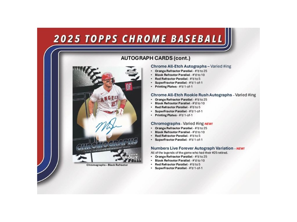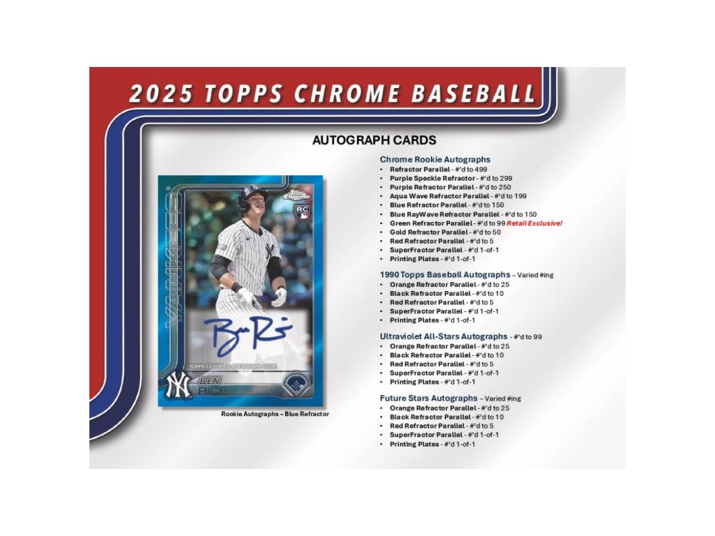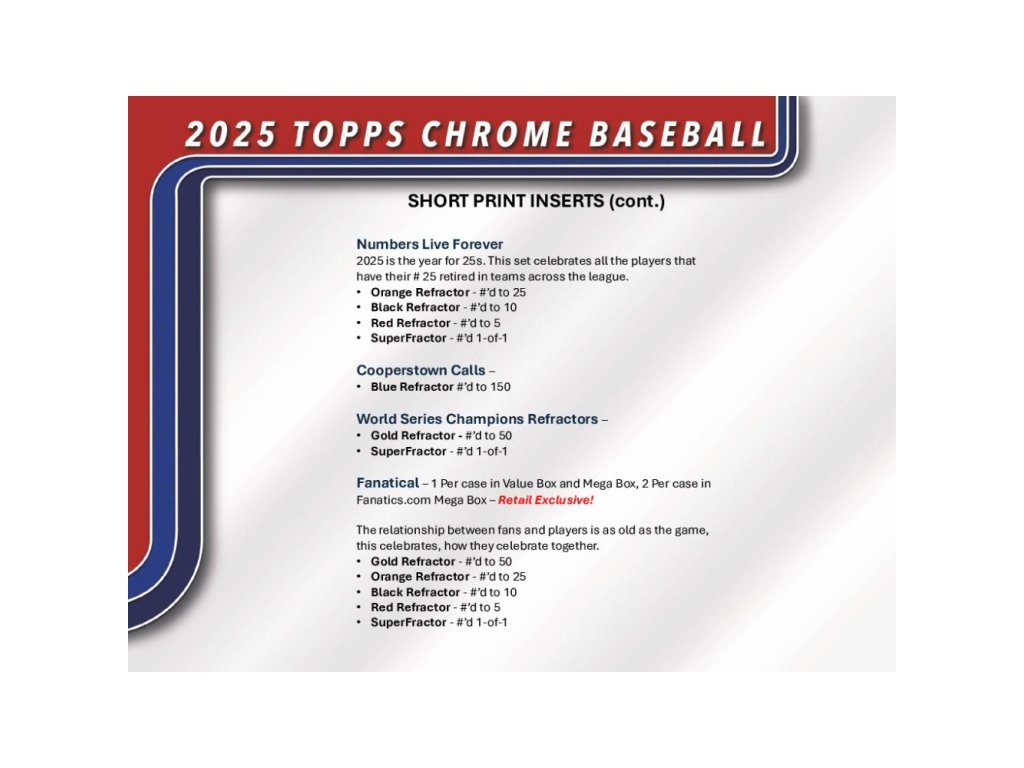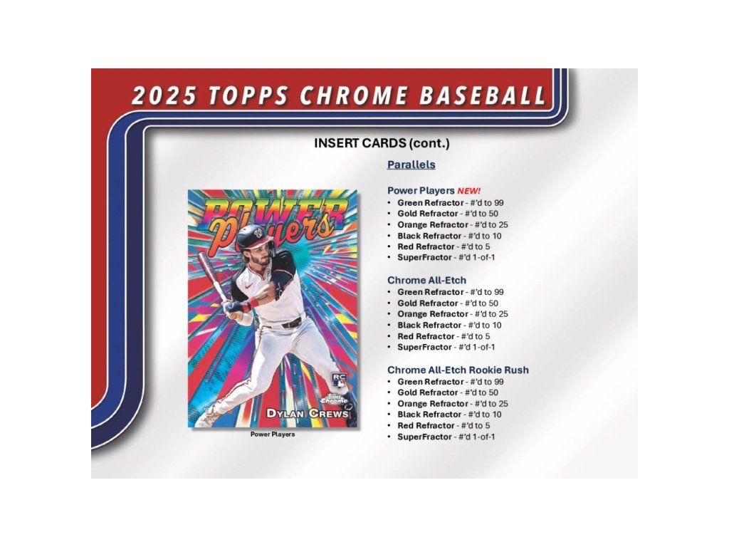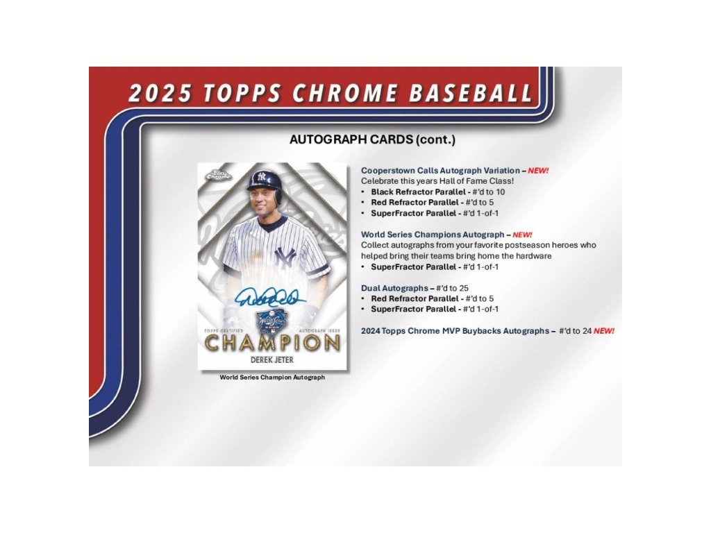 2025 Topps Chrome Baseball představuje 30. vydání chromových karet svého vlajkového produktu. Letošní edice obsahuje vzrušující přírůstek zlatých Logoman mamorabilií. Base set podtrhuje široká kolekce barevných Refraktorek a v centru pozornosti celého produktu budou opět raritní inserty a podpisovky přímo na kartách.