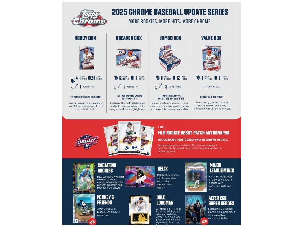 Nováčci se v roce 2025 v baseballu Topps Chrome Update Series ocitli v centru pozornosti, a to v mnoha podobách. Od záplavy základních karet nováčků přes autogramy nováčků Chrome až po nesmírně populární autogramy s nášivkou Rookie Debut, série Chrome Update je pro sběratele skvělou volbou.