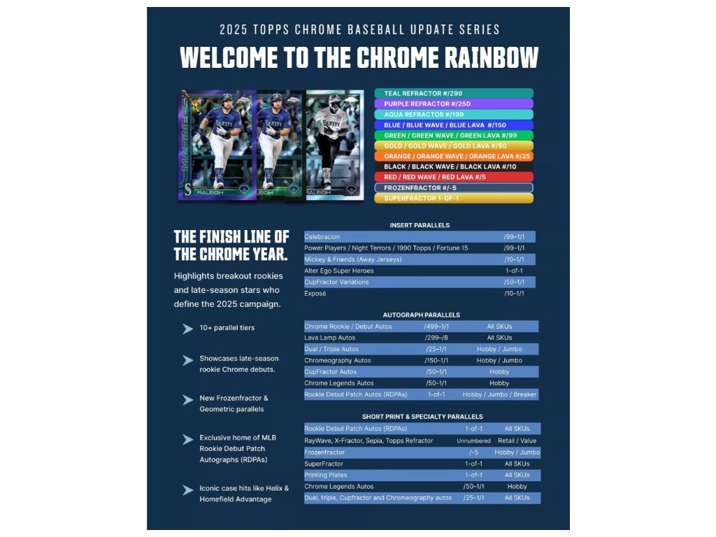 Mezi další inserty patří Alter Ego Superheroes, Celebracion, Fortune 15, baseballový tým Topps Chrome z roku 1990, zápas hvězd 2025 (včetně 11 variant obrázků), figurky Major League Minis a Night Terrors.