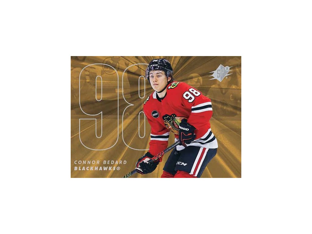 V neposlední řadě můžete v sérii tento rok najít také velmi lákavé UPDATE karty, včetně extrémně zajímavé karty Rookie karty CONNORA BEDARDA - 2023-24 Update - UD Black Lustrous Rookie Auto Patch Spectrum Parallel 1/1