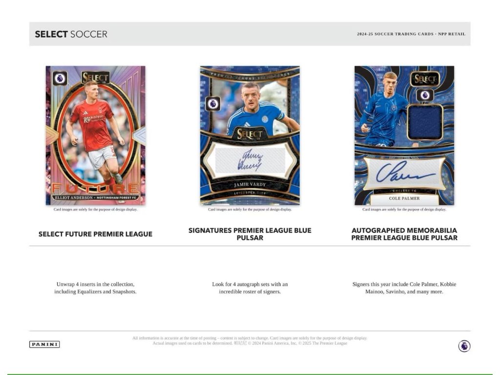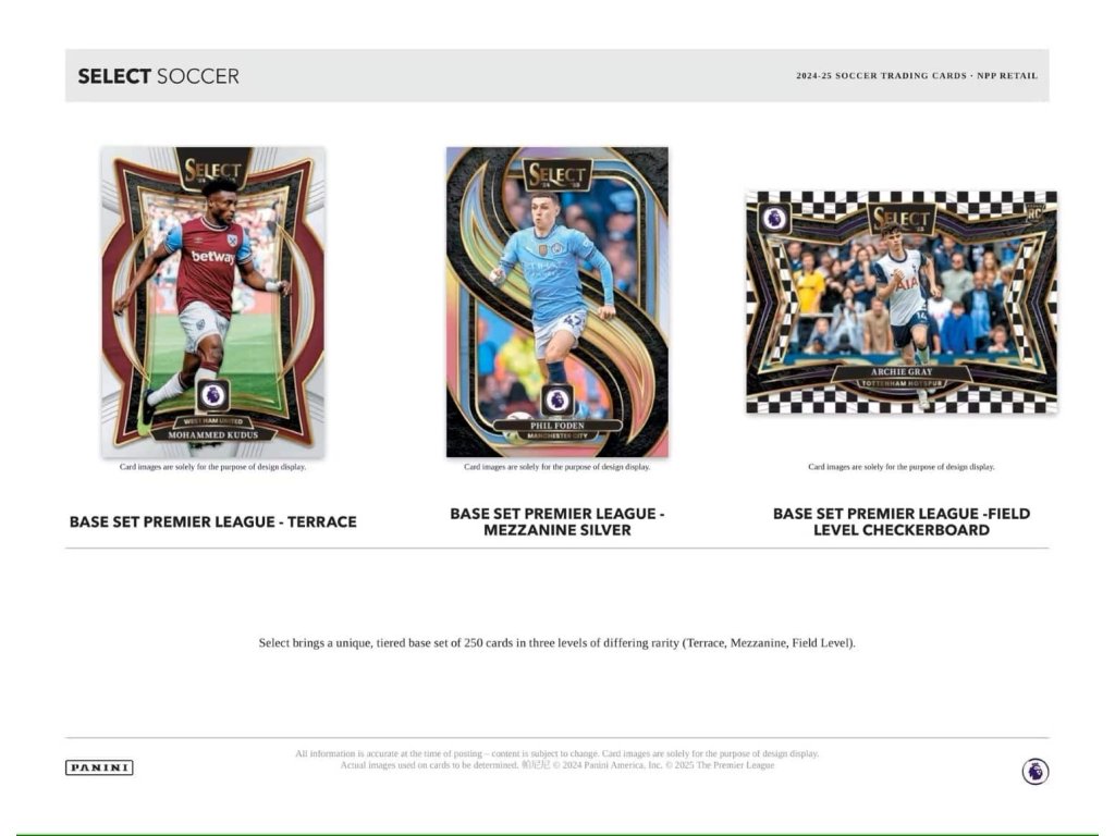 Oblíbená značka Select se vrací do fotbalu v sezóně 2024/25 s edicí Premier League se všemi 20 týmy! Karty Panini Select Premier League Soccer pro sezónu 2024-25 nabízejí více lesku na některé z nejlepších sportů. Select si zachovává podobné zaměření a nastavení jako v posledních několika letech a má několik specifických prvků, které doplňují jeho chromovaný vzhled a široký seznam paralel.