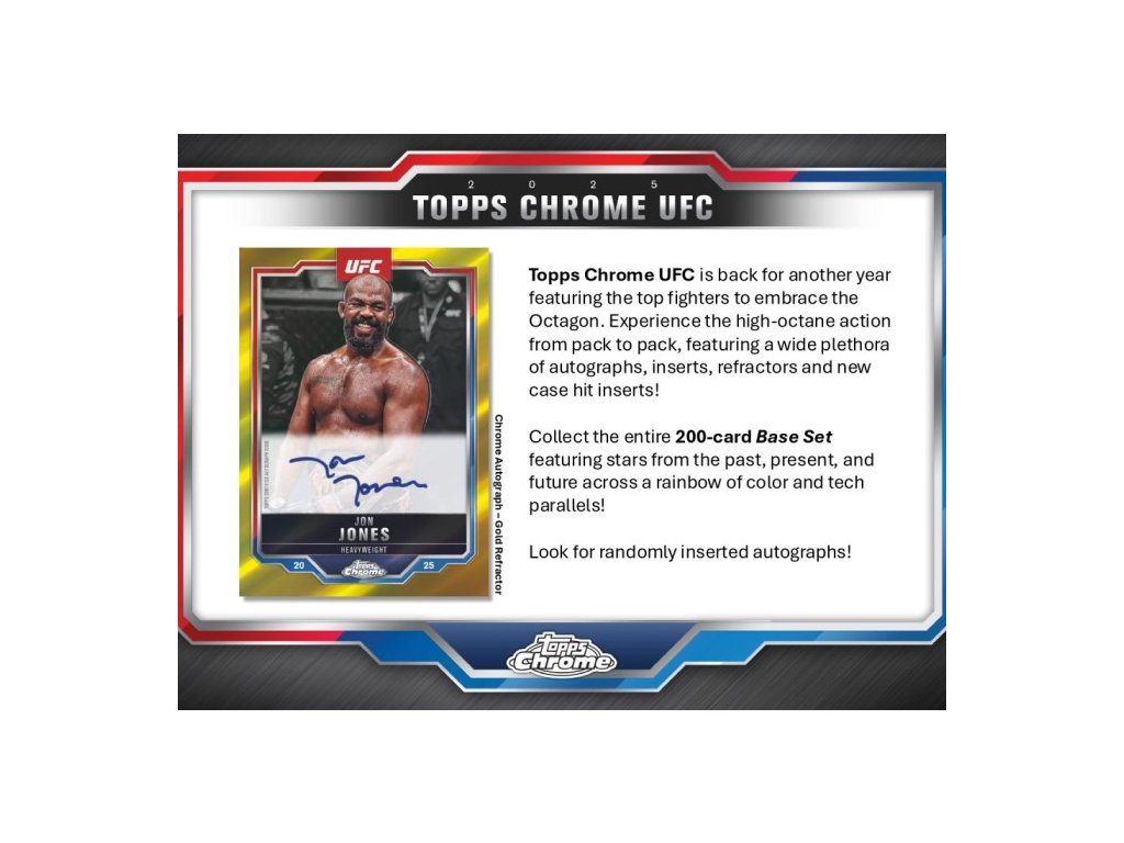 Topps Chrome UFC je zpět na další rok s nejlepšími bojovníky, kteří jsou v Oktagonu! Celý set obsahuje 200 karet Base set se Stars z minulosti, přítomnosti, ale i budoucí hvězdy na Rainbow of color a Tech parallels! Široké množství autographs, inserts, refractors a další.